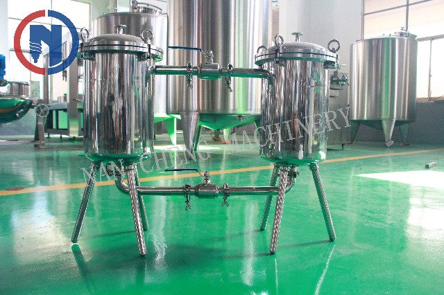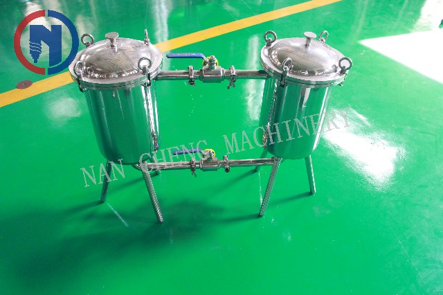 雙聯(lián)過濾器內(nèi)外表面拋光處理,濾筒內(nèi)裝有不銹鋼濾網(wǎng)和濾網(wǎng)支撐籃;頂部裝有放氣閥,供過濾時排放濾器內(nèi)空氣作用。上蓋與濾筒連接采用快開式結(jié)構(gòu),更方便清洗(更換)濾網(wǎng),三只可調(diào)節(jié)式支腳可使濾器平穩(wěn)放置在地面上。連接管路采用活接或卡箍連接方式,進出料閥門采用三通球閥啟閉,耐壓耐溫,操作靈活方便,無料液泄漏更衛(wèi)生。